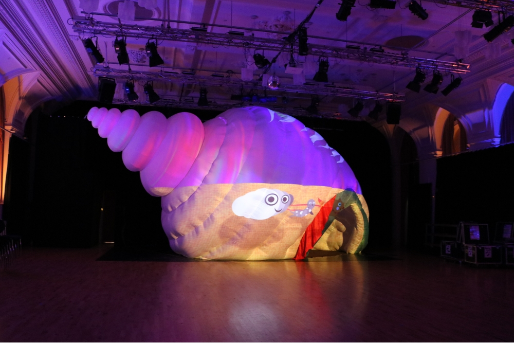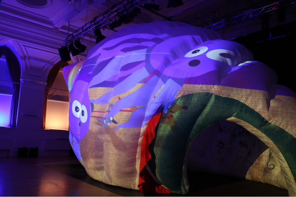 ‘Voyage of the Story Shell’ is an ambitious multi-artform project from Barnsley Libraries, created by The Colour Foundry – the creative collaboration formed by artists Fabric Lenny, Urban Projections and Nicholas Lewis. The installation transforms one of Barnsley’s most loved family art spaces into an immersive journey of light, music, animation and projected illustration.