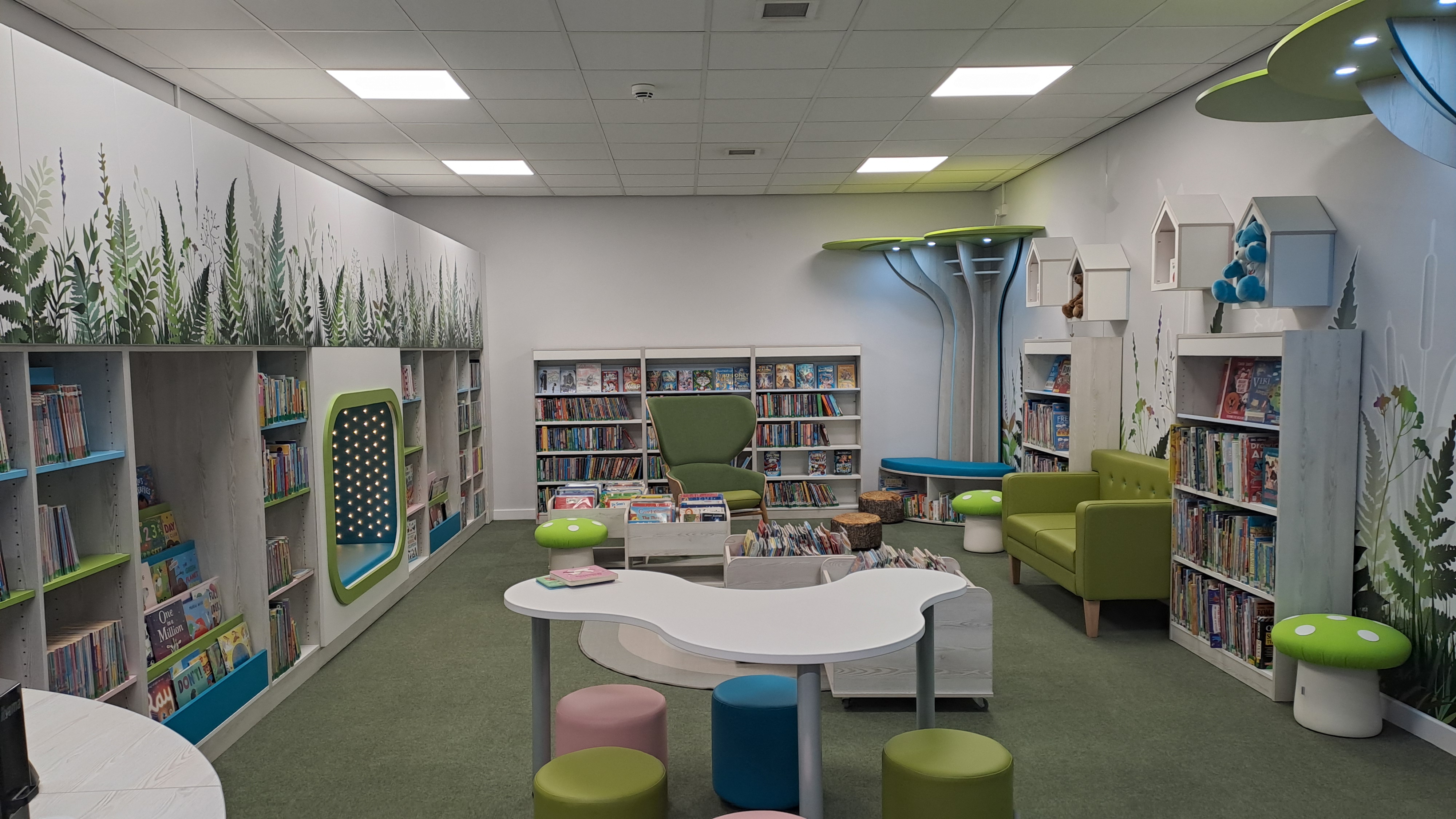 The refurbishment included creating a larger children’s library area with a welcoming nature theme and vibrant décor.