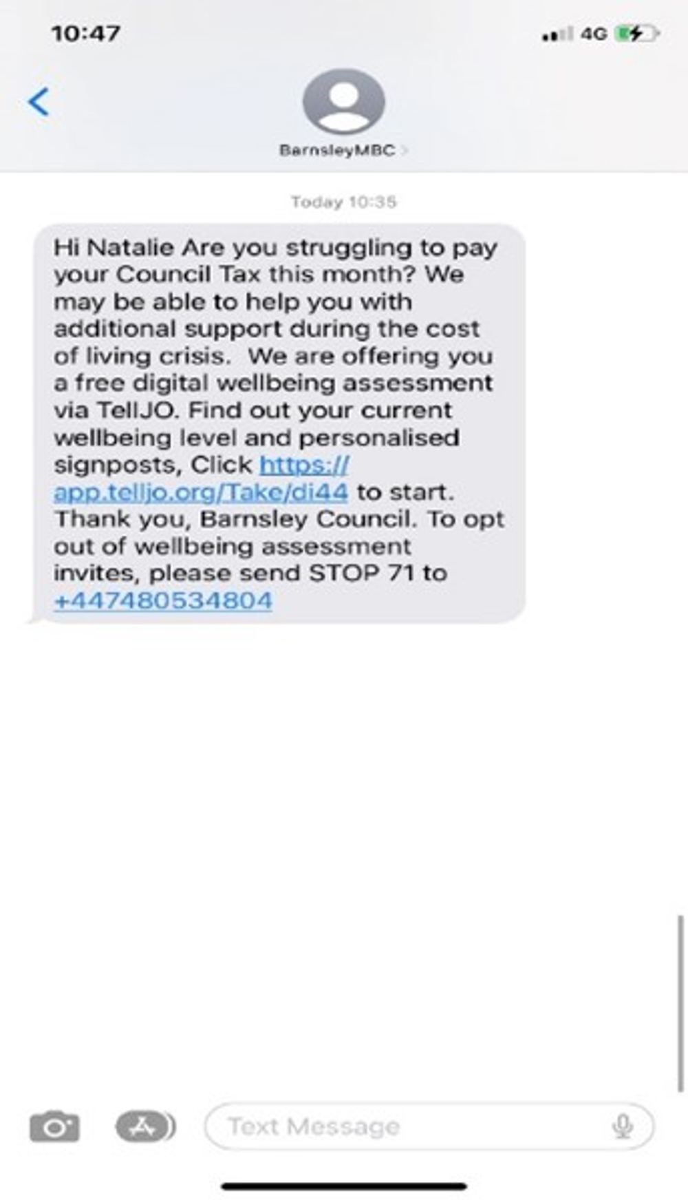You may receive a text message from us to complete a wellbeing assessment with TellJO. The message will look like this: